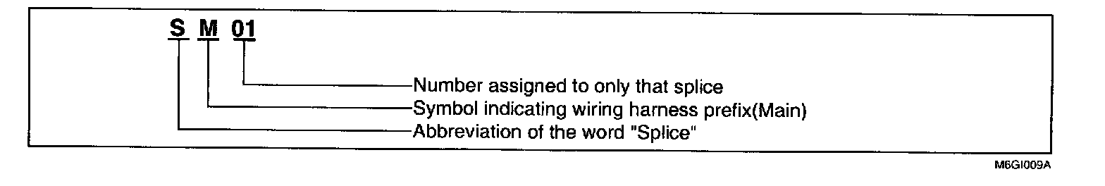 A splice identification symbol consists of a wiring harness location classification symbol corresponding to each wiring harness location and number corresponding to the splice. These splice locations can be found in the HARNESS LAYOUTS.
