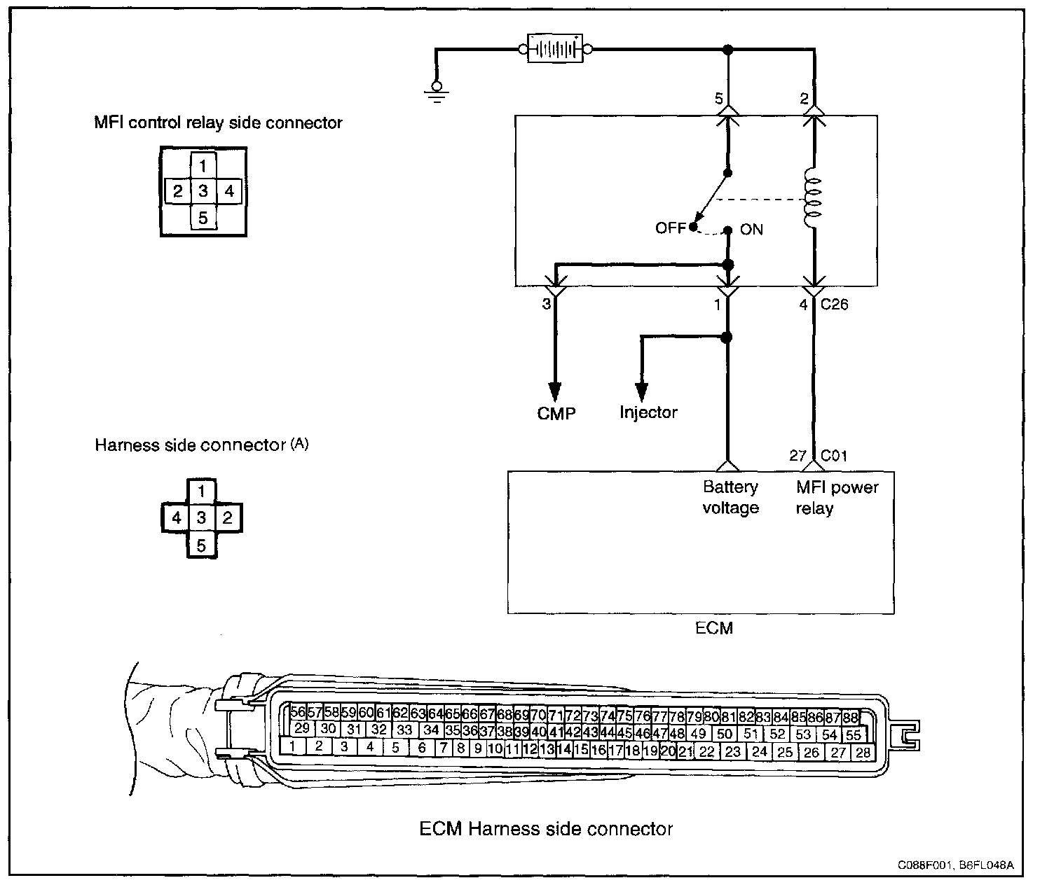 When the ignition switch is on, battery power is supplied to the ECM, the injector, the mass airflow sensor, etc. When the ignition switch is turned on, current flows from the ignition switch through the current relay coil to ground.