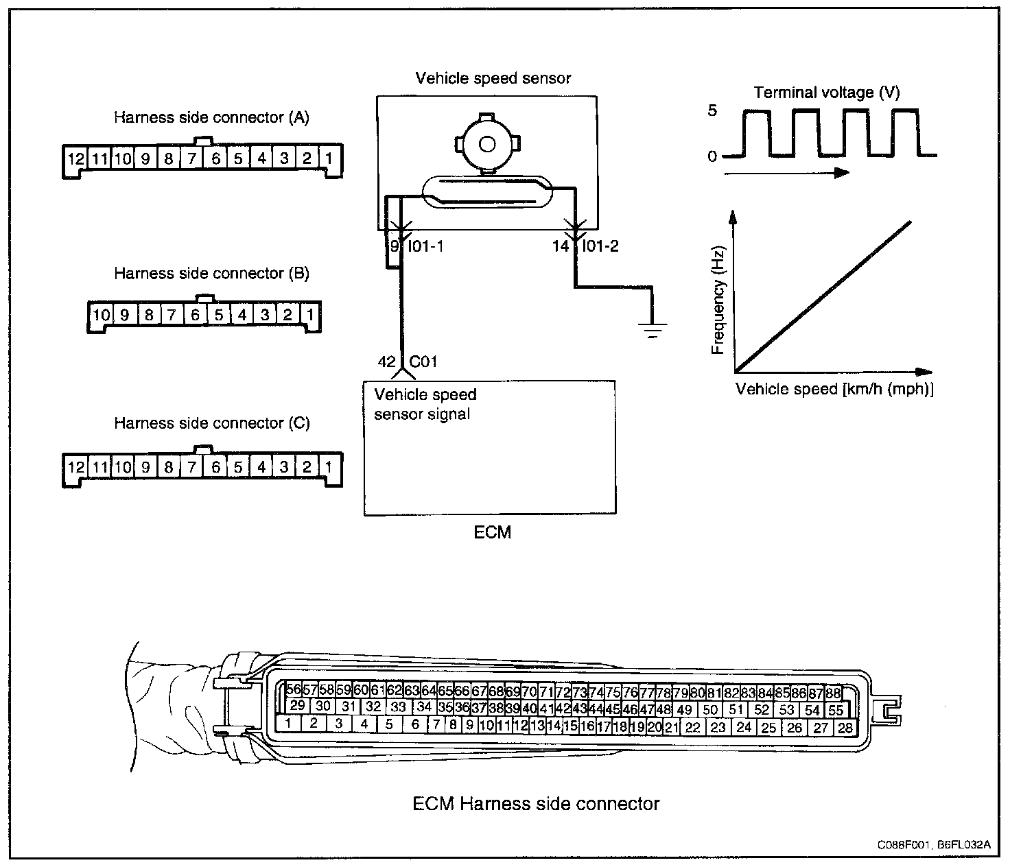 The vehicle speed sensor is a reed switch. The vehicle speed sensor is built into the speedometer and coverts the transaxle gear revolutions into pulse signals, which are sent to ECM.