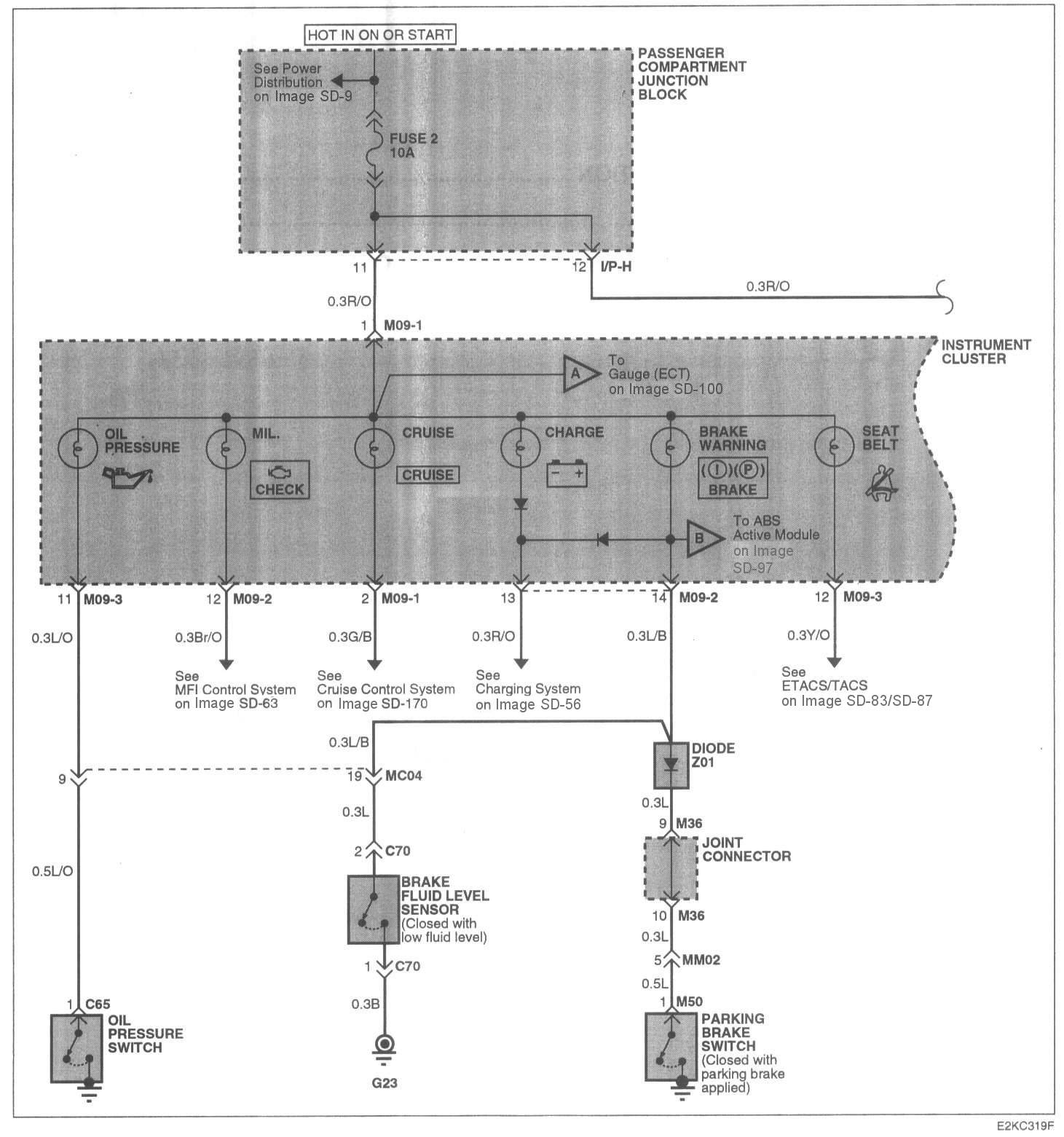 The starting point of each system section is the schematic diagram. These diagrams show how all the components work together, such as electrical current paths from power source to ground (via electrical load), switch connections at each position, and other related circuit functions.