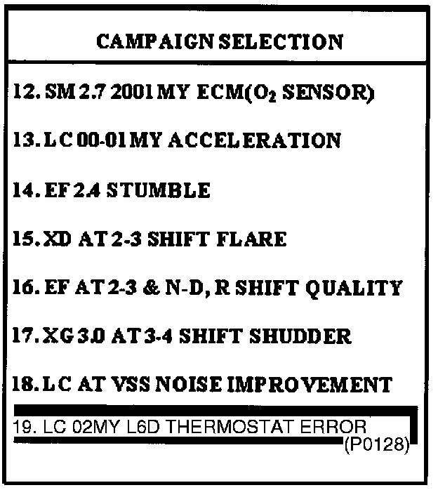 3. Select option "19. LC 02MY 1.6D THERMOSTAT ERROR (P0128)" and press ENTER.