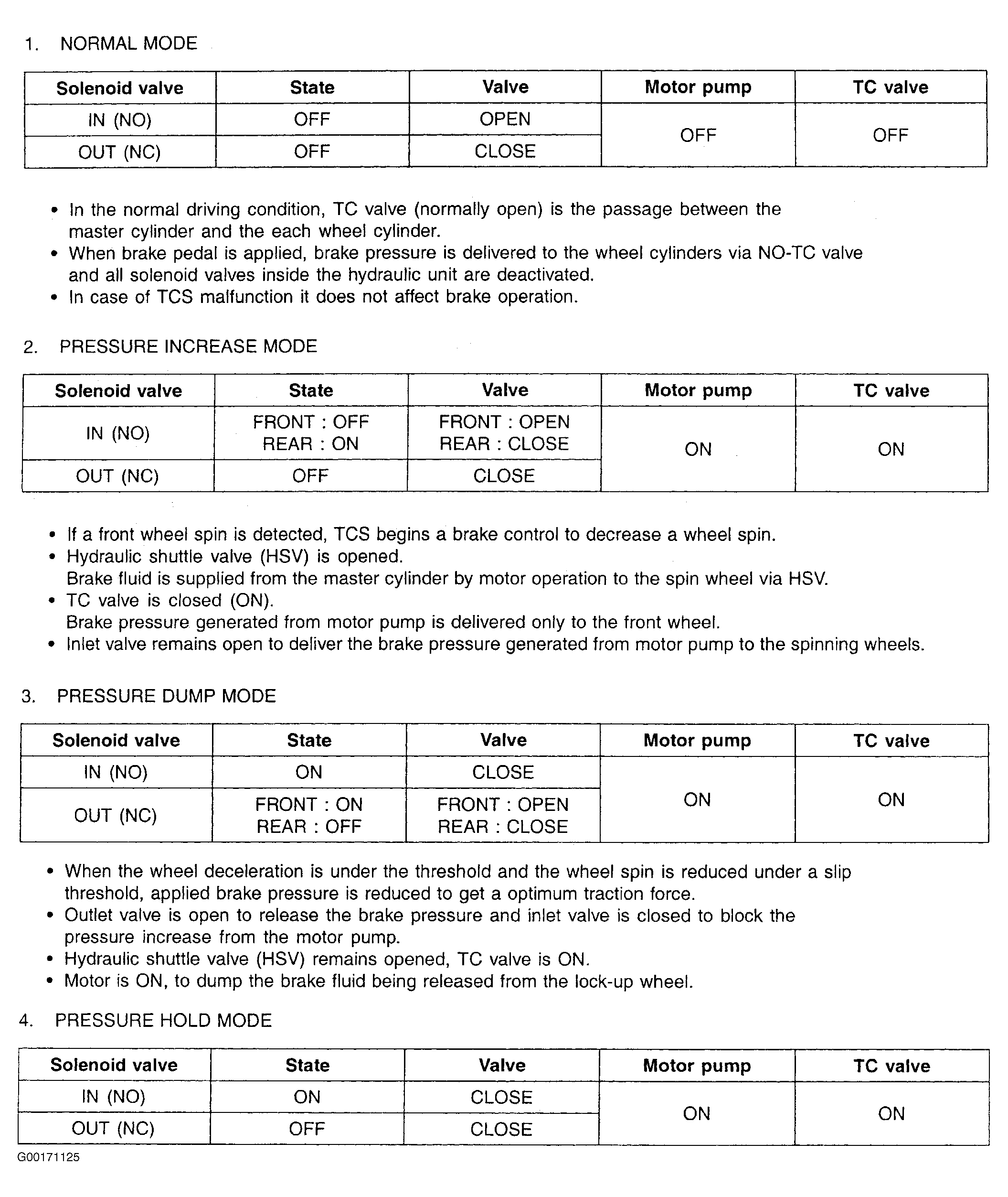 The TCS system uses ABS system self-diagnostic system and fail-safe system to aid in servicing. When system detects a malfunction, HECU disables traction control and allows normal braking only. System then stores a Diagnostic Trouble Code (DTC) and illuminates TCS warning light. DTCs are retrieved for diagnosis through use of a HI-SCAN (PRO) or generic scan tool. See DIAGNOSIS & TESTING . For description of TCS control system operational modes. See Fig 1 .