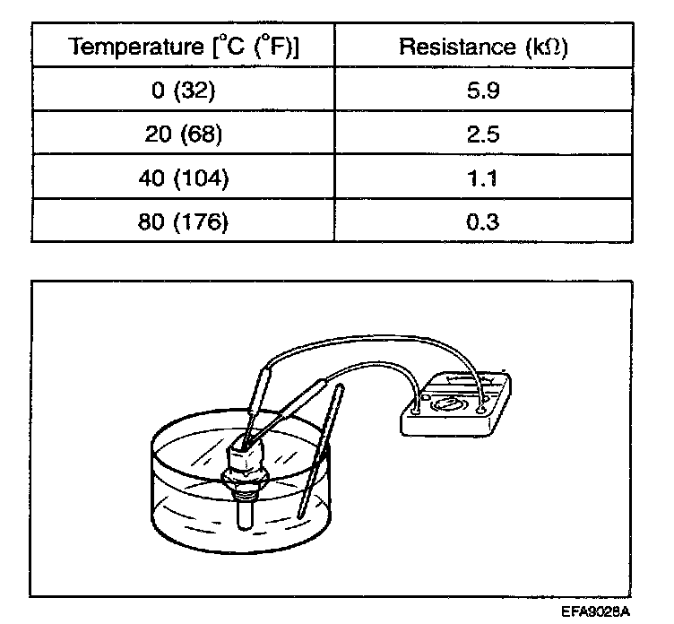 2. With the temperature sensing portion of the engine coolant temperature sensor immersed in hot engine coolant, check the resistance.