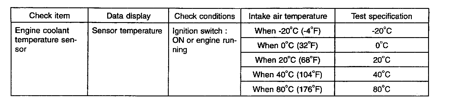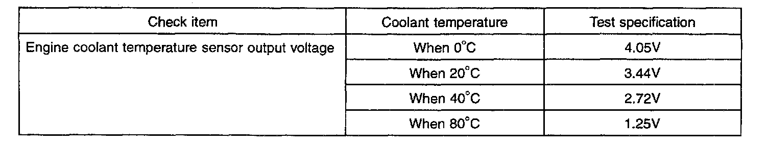 The engine coolant temperature sensor installed in the engine coolant passage of the cylinder head detects the engine coolant temperature and emits signals to the PCM. This part employs a thermistor which is sensitive to changes in temperature. The electric resistance of the thermistor decreases in response to a temperature rise (NTC). The PCM determines engine coolant temperature by the sensor output voltage and provides optimum fuel enrichment when the engine is cold.