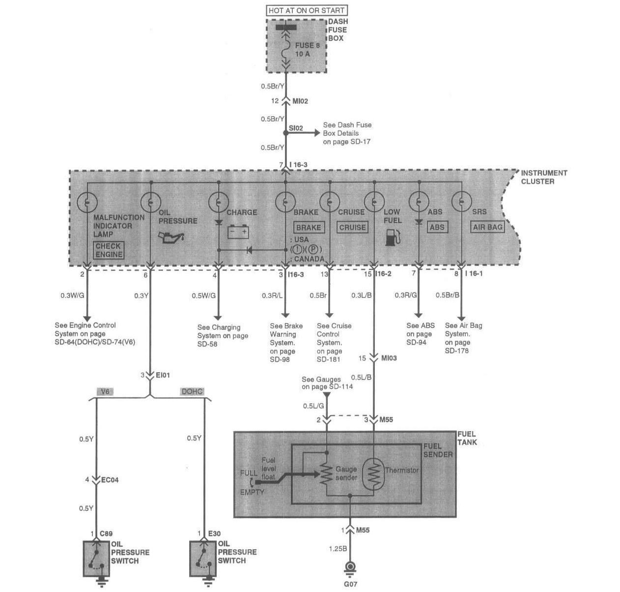The starting point of each system section is the schematic diagram. These diagrams show how all the components work together, such as electrical current paths from power source to ground (via electrical load), switch connections at each position, and other related circuit functions.