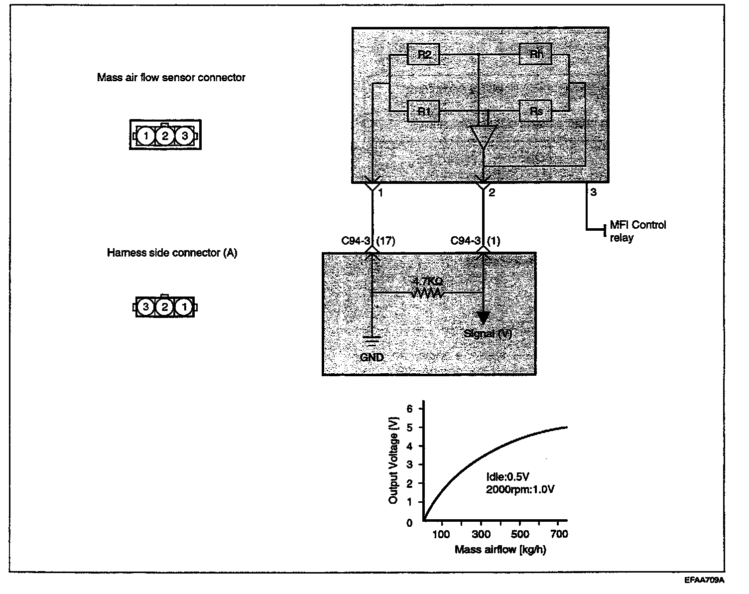 2. If the MAF sensor output voltage is other than 0 when the ignition switch is turned on (do not start the engine). Check for a faulty MAF sensor or ECM.