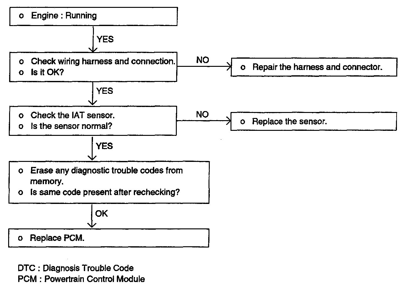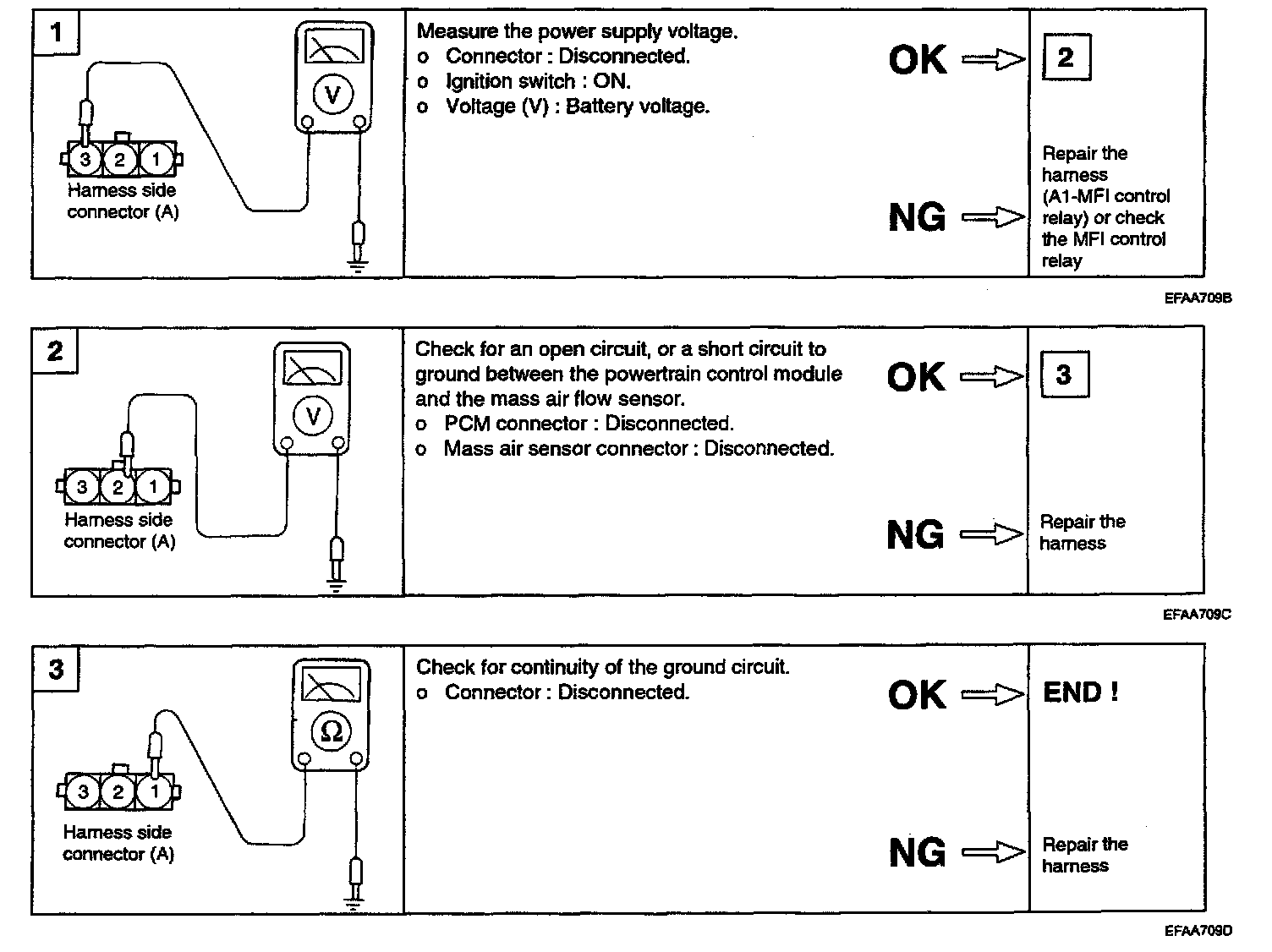 2. If the MAF sensor output voltage is other than 0 when the ignition switch is turned on (do not start the engine). Check for a faulty MAF sensor or ECM.