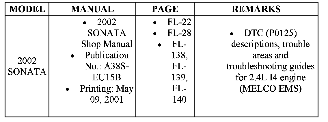 The diagnostic information for Diagnostic Trouble Code (DTC) P0125 in the 2002 SONATA Shop Manual pages listed below is inconsistent.