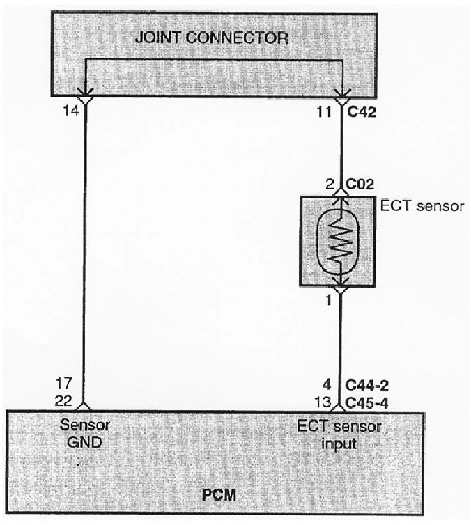 The engine coolant temperature sensor (ECTS) is located in the engine coolant passage of the cylinder head for detecting the engine coolant temperature. The ECTS uses a thermistor whose resistance changes with the temperature. The electrical resistance of the ECTS decreases as the temperature increases and increases as the temperature decreases. During cold engine operation, the ECM increases the fuel injection duration and controls the ignition timing using the information of engine coolant temperature to improve driveability.