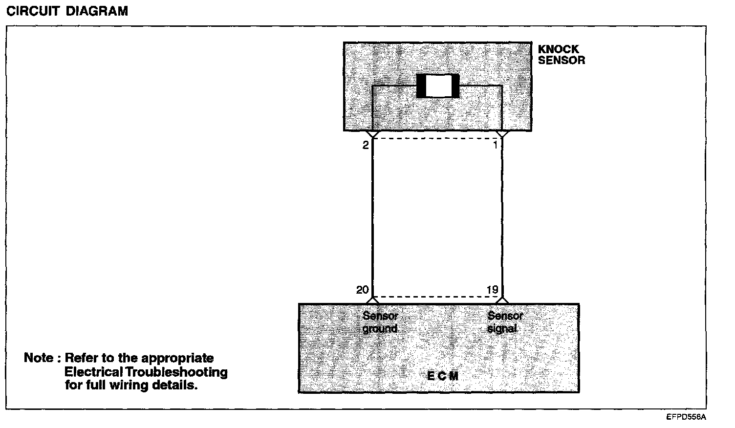 KNOCK SENSORThe knock sensor is attached to the side of the cylinder block to sense engine knocking. A knocking vibration from the cylinder block is applied as pressure to the piezoelectric element. This vibrational pressure is then converted into a voltage signal which is relayed to the ECM. If engine knocking occurs, ignition timing is retarded to suppress it.