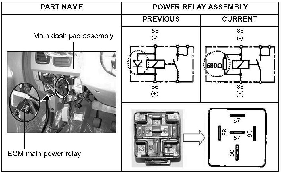 On MY Accent vehicles, the engine control module (ECM) main power relay type located under the main dash pad has been changed.