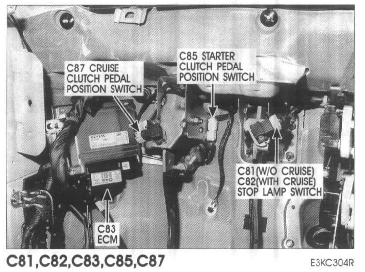 C85 C81(W/O Cruise), C82(With Cruise) Stop Lamp Switch, C83 ECM, C85 Starter Clutch Pedal Position Switch, C87 Cruise Clutch Pedal Position Switch (M/T):