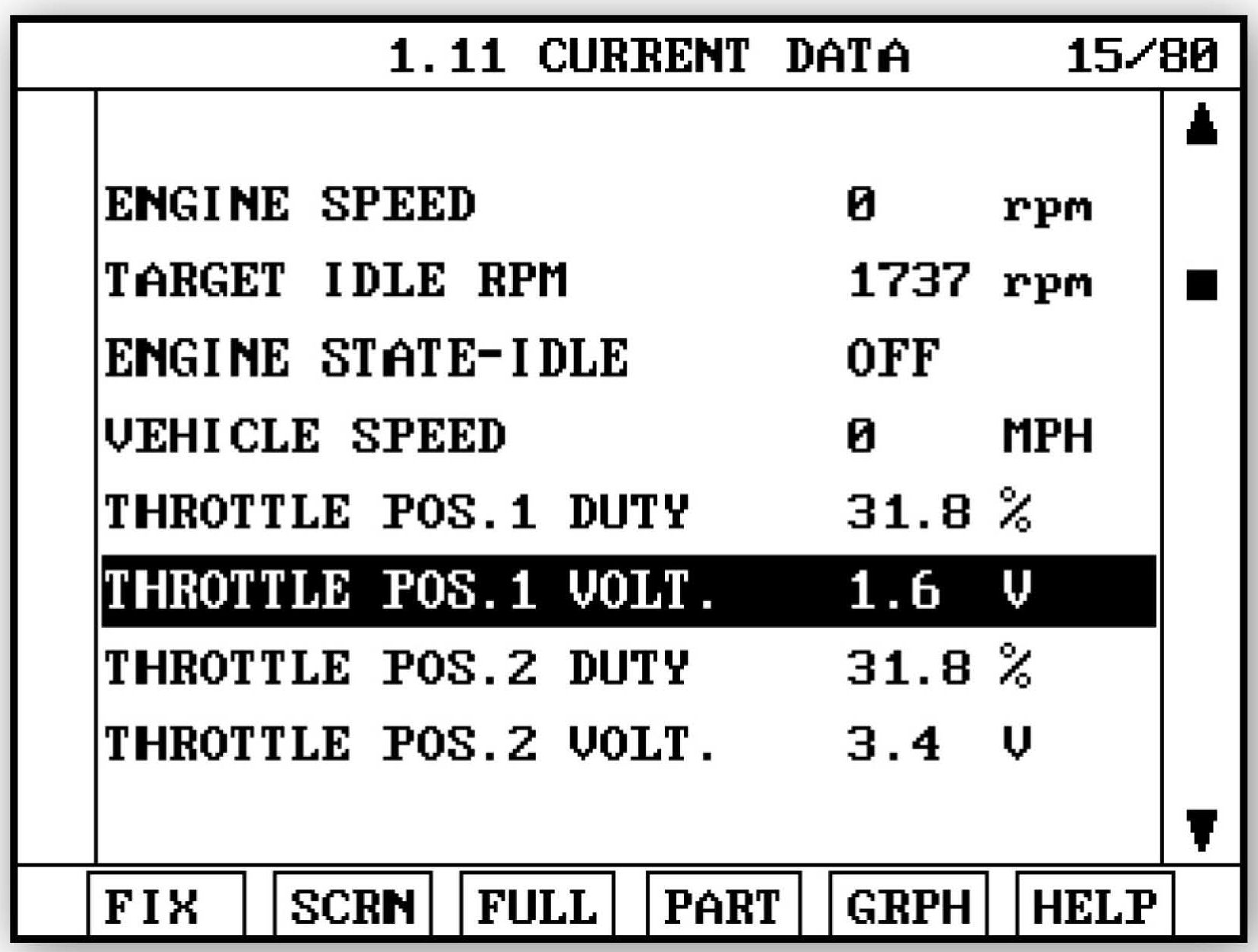 3. Attach a Hi-Scan Pro or GDS and select "Engine" menu, "Current Data" menu and throttle position sensor in volts ("THROTTLE POS. SENSOR", "ACCEL. P0S. S," or "ACCEL PEDAL 1 VOLT", depending on model).