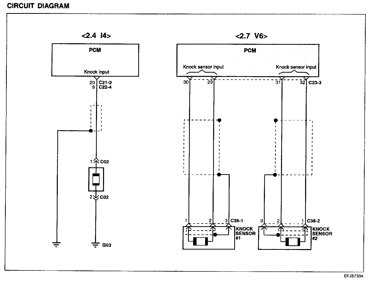 The knock sensor is a piezoelectric device attached to the cylinder block that senses pressure from engine knocking conditions. This vibrational pressure is then converted into a voltage signal which is delivered as output. If engine knock occurs, ignition timing is retarded to suppress it.