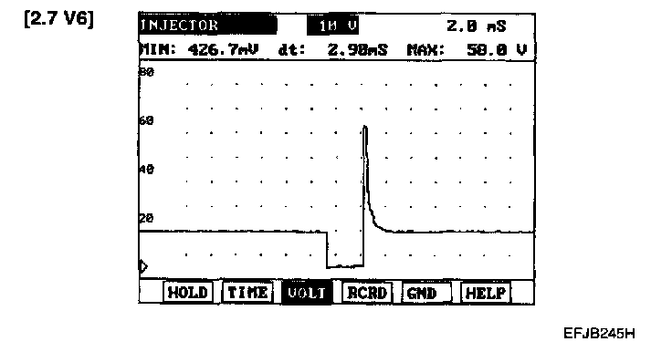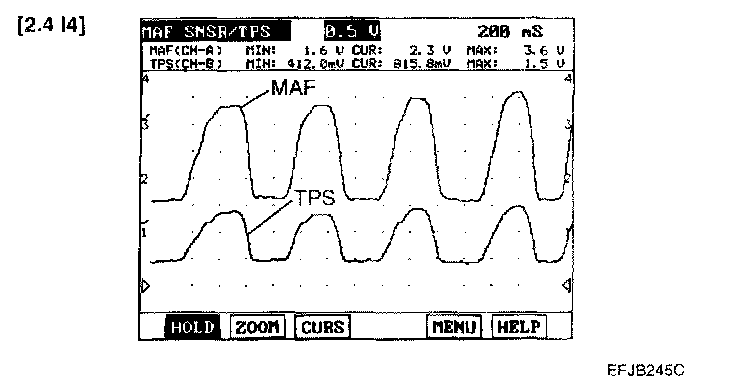MAJOR SENSOR REFERENCE WAVE-FORMSThe following are the major sensor reference wave-forms. Below is the data for CMP, Mass Air Flow Sensor, Throttle Position Sensor, Rear O2 Sensor, Front O2 Sensor and Injection Pulse when rewing quickly up to 4800 rpm under no load after warming up engine sufficiently. Each value is for reference, the exact values may vary.