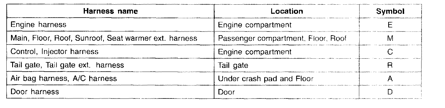 Electrical wiring connectors are classified according to the wiring parts in the Harness Layouts.