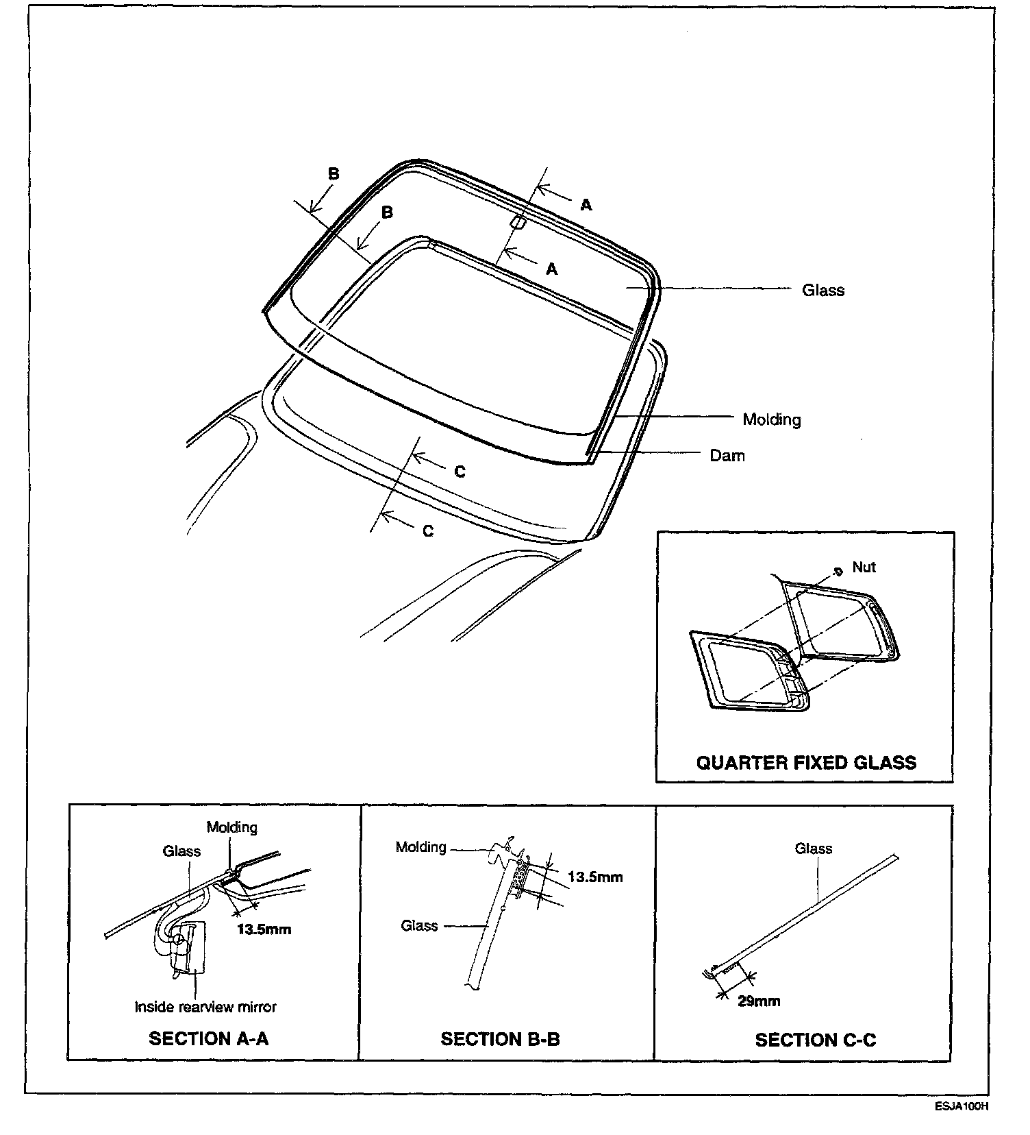 CAUTION: Be careful not to remove more adhesive than necessary, and also not to damage the paintwork on the body surface with the knife. If the paintwork is damaged, repair the damaged area with touch-up paint.