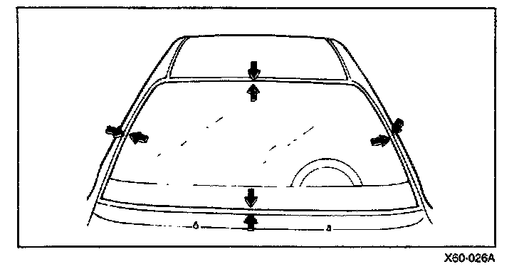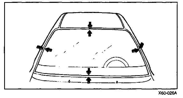 3. Center the new windshield glass in the opening. Mark the location by marking lines across the glass and body with a grease pencil at the four points as shown.