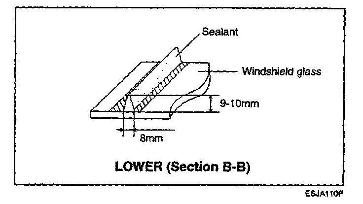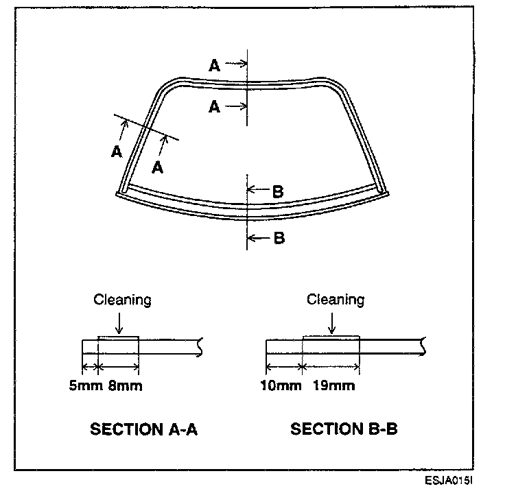 1. Using a knife or the special tool(09861 - 31200), cut the old sealant smoothly to a thickness of about 2 mm (0.08 in.) on the bonding surface around the entire windshield flange.