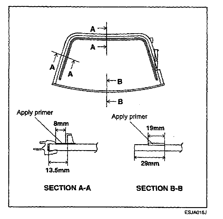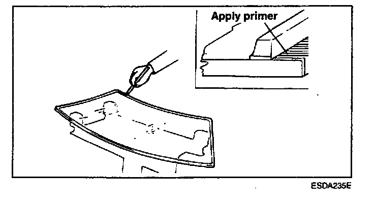 9. Apply a light coat of body primer to the original sealant remaining around the window opening flange. The glass should be installed within 10 minutes after you apply the primer.