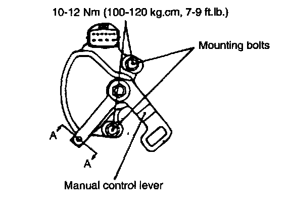 4. Loosen the transaxle range switch body mounting bolts and then turn the transaxle range switch body so the hole in the end of the manual control lever and the hole (cross section A-A in the figure) in the flange of the transaxle range switch body flange are aligned.