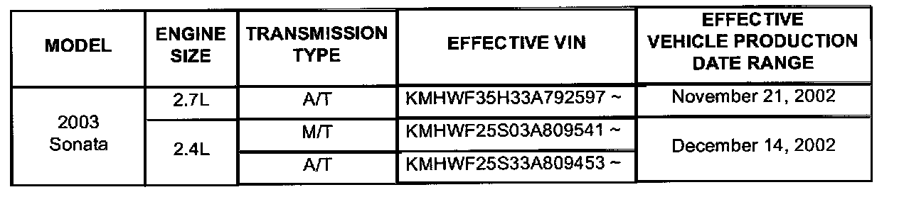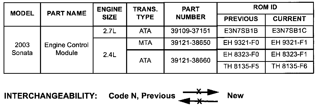 The 2003 MY Sonata Engine Control Module (ECM) logic has been changed to include a function for increasing the idle speed under certain conditions. This logic was incorporated to prevent the battery voltage from dropping too low under certain conditions.