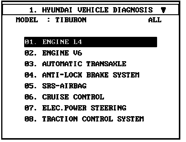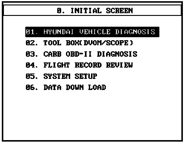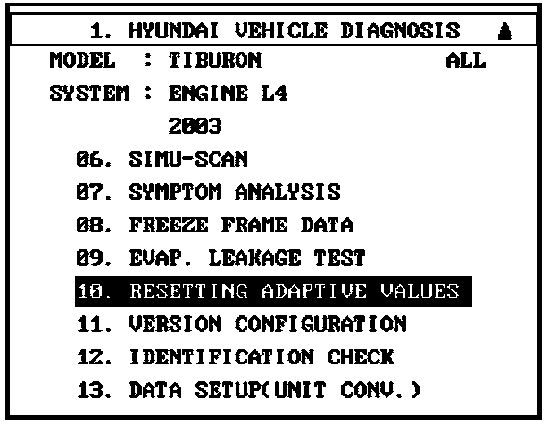 Before reprogramming the ECM, first erase ECM adaptation values by following the procedure below:1. Using the Hi-Scan Pro with the SOL System Card Installed, choose the Hyundai Vehicle Diagnosis Menu.