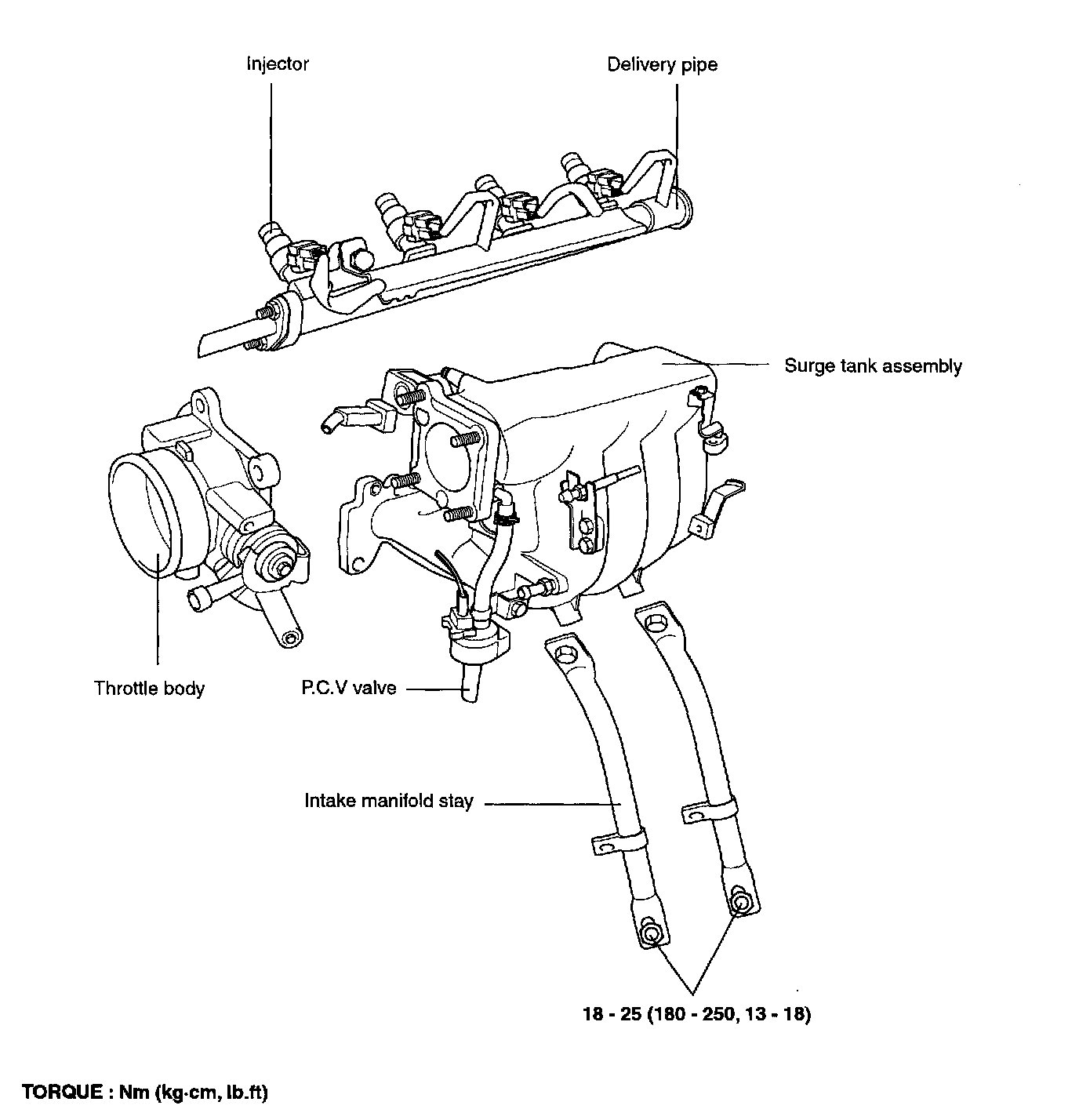 Intake manifold stay to cylinder block bolts.......18-25 Nm (180-250 kg-cm, 13-18 ft. lbs.)