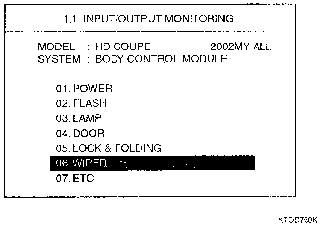 Home >> Hyundai >> 2003 >> Tiburon V6-2.7L >> Repair and Diagnosis >> Body and Frame >> Body Control Systems >> Body Control Module >> Testing and Inspection >> Component Tests and General Diagnostics >> Wiper & Washer Control Function