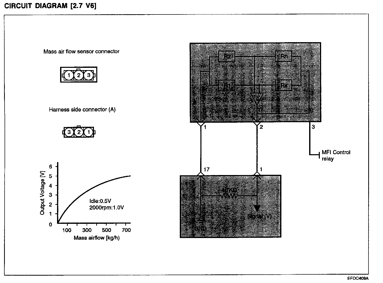 2. If the MAF sensor output voltage is other than 0 when the ignition switch is turned on (do not start the engine). Check for a faulty MAF sensor or ECM.