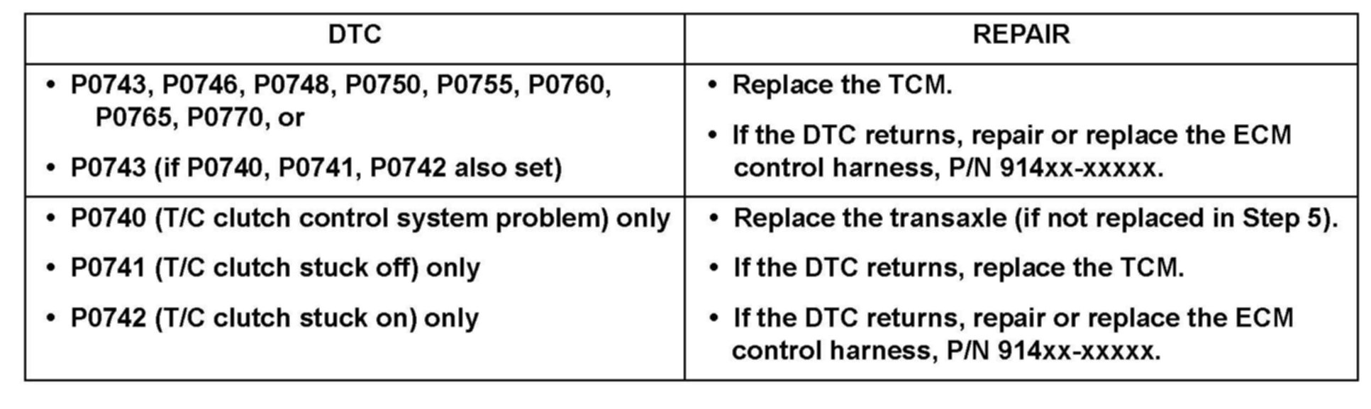 14. Clear the codes and test drive the vehicle for two driving cycles (two key-on to key-off driving cycles, including 1-2-3-4 upshifts and 4-3-2-1 downshifts). If the DTC returns, perform the repairs shown above.
