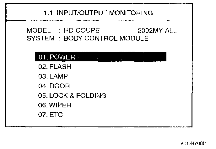 1. Select "01 POWER" and press [ENTER] Then the following screen will be displayed. Check BCM input condition against door warning switch.