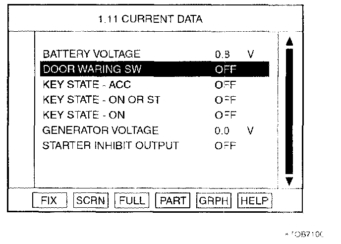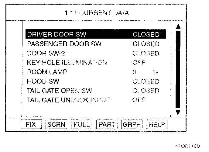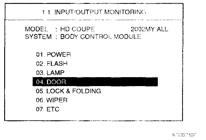 2. Select "04 DOOR" and press [ENTER] Then, the following screen will be displayed. Check BCM input condition against driver's side door switch and passenger's side door switch.