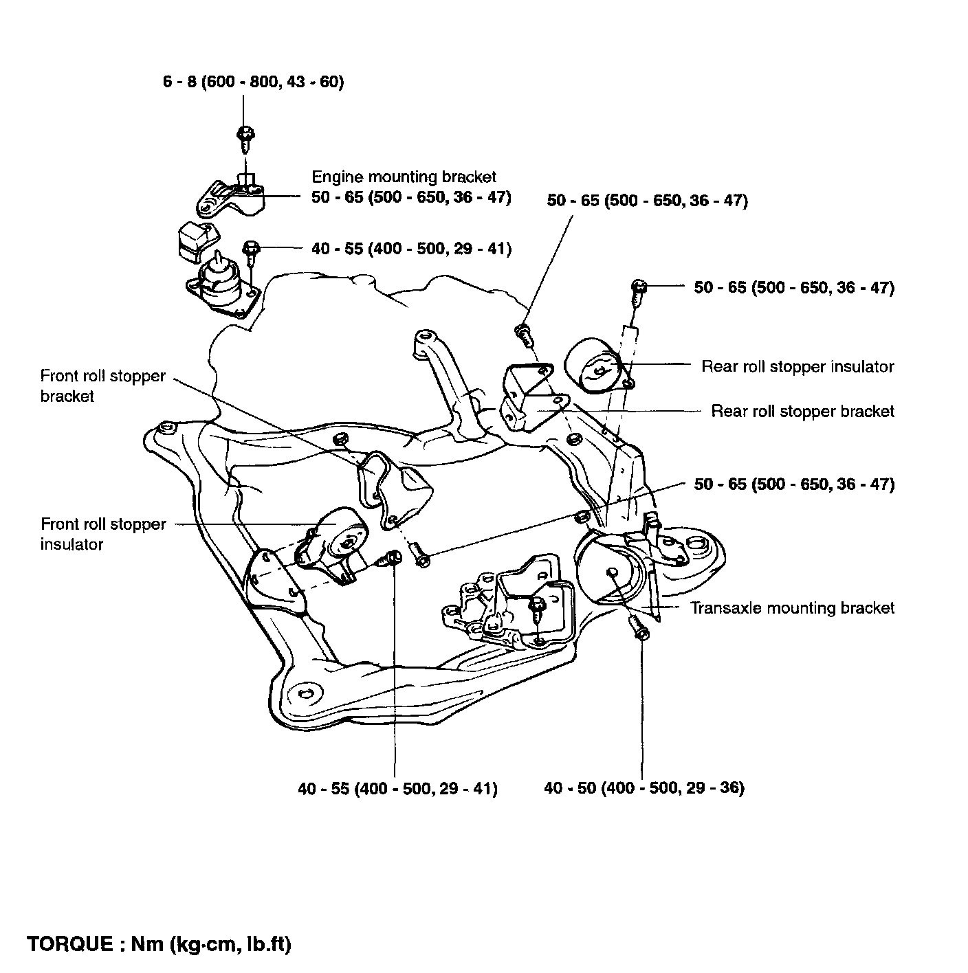 Rear roll stopper bracket to cross member bolt 40 - 55 Nm (29 - 40 ft. lbs.)