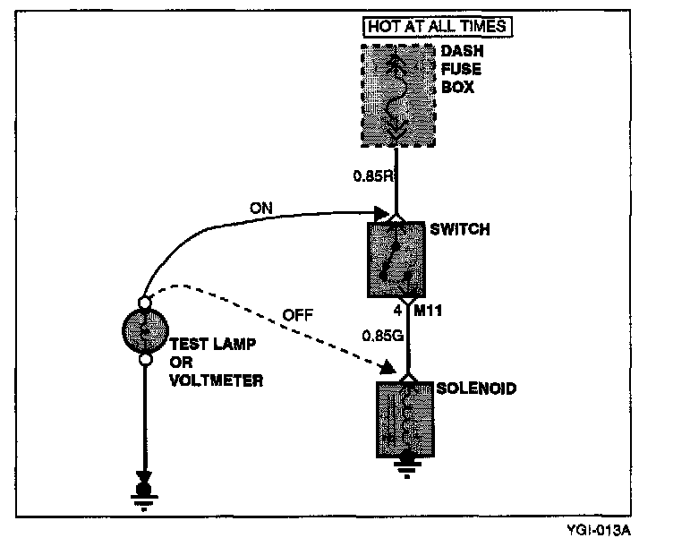 1. Connect one lead of a test lamp or voltmeter to a ground. If you are using a voltmeter, be sure it is the voltmeter's negative test lead you have connected to ground.