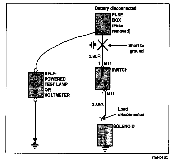 5. When the self-powered test lamp glows, or ohmmeter registers, there is a short to a ground in the wiring near that point.