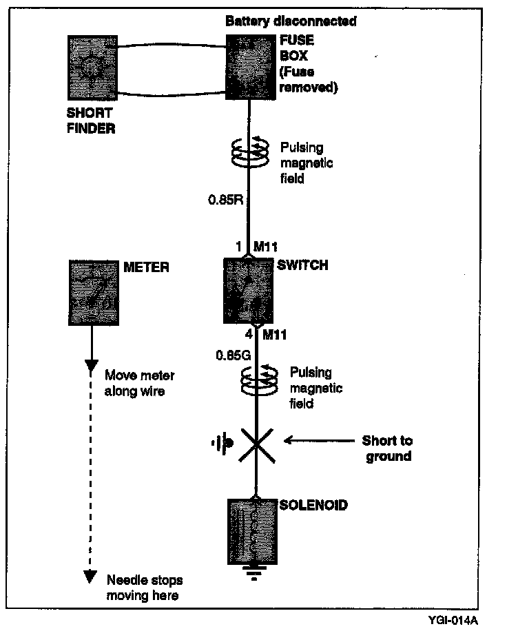 5. Beginning at the fuse box, slowly move the short finder along the circuit wiring. The meter will show current pulses through sheet metal and body trim. As long as the meter is between the fuse and the short, the needle will move with each current pulse. Once the meter is moved past the point of the short, the needle will stop moving. Check around this area to locate the cause of the short circuit.