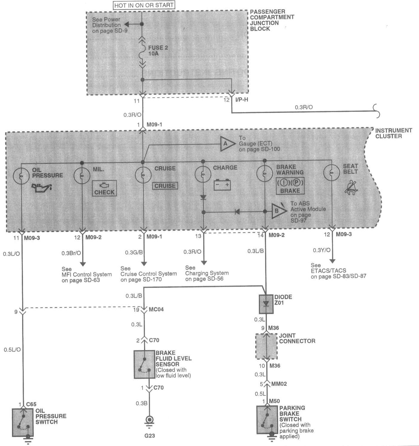 The starting point of each system section is the schematic diagram. These diagrams show how all the components work together, such as electrical current paths from power source to ground (via electrical load), switch connections at each position, and other related circuit functions.