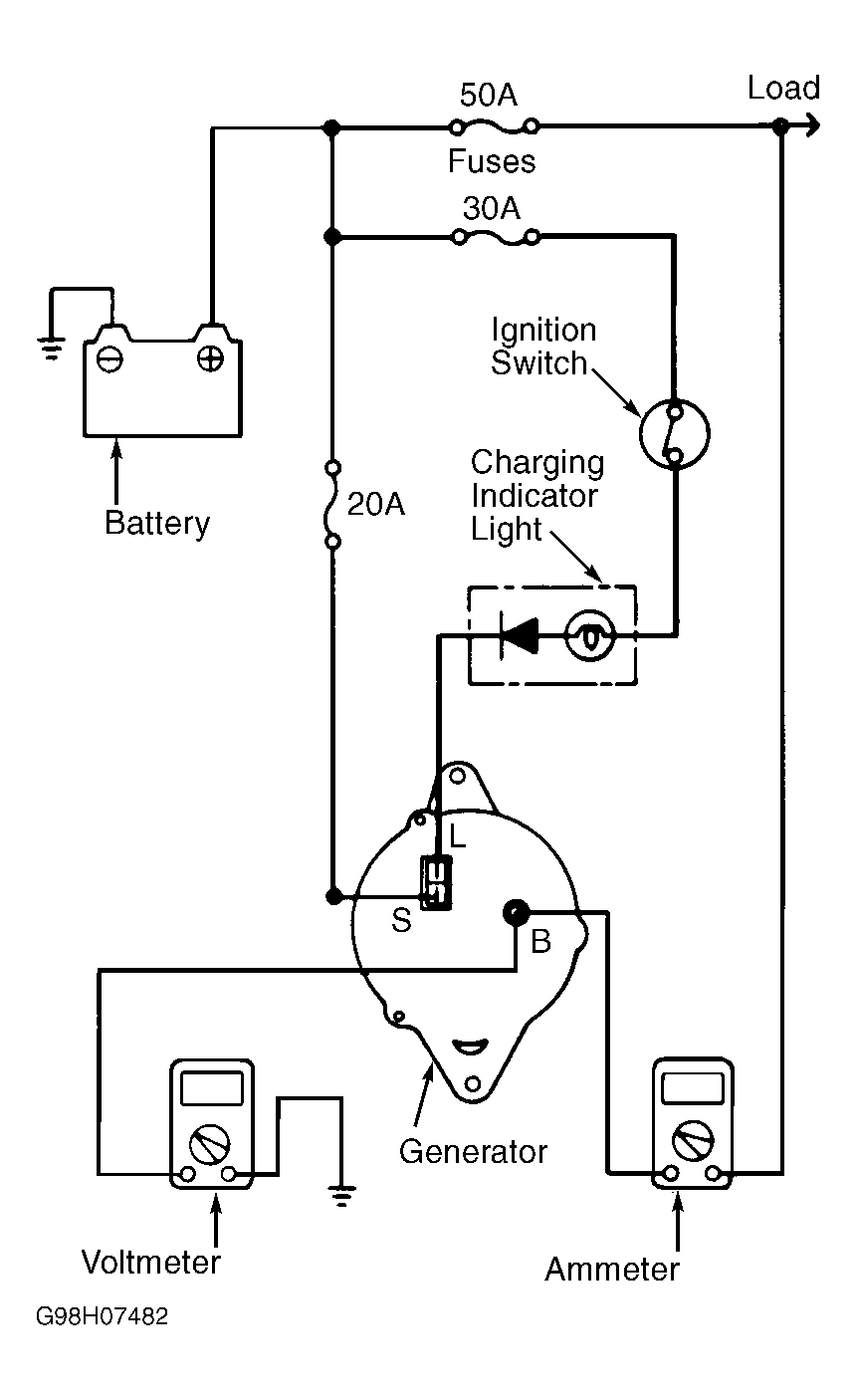 - Connect a DC ammeter (0 to 100A) in series between the terminal "B" and the disconnected output wire. Be sure to connect the negative lead of the ammeter to generator terminal "B" harness connector. See Fig 1 .