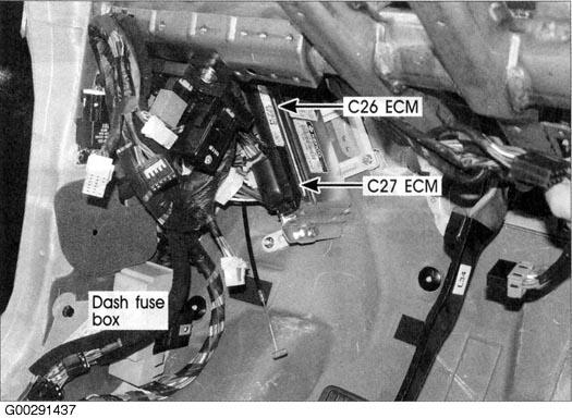 On left side of engine compartment, in front of strut tower. See Figure. |