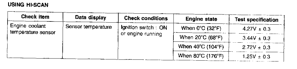 The engine coolant temperature sensor is located in the engine coolant passage of the cylinder head. It detects the engine coolant temperature and relays signals to the ECM. It employs a thermistor which is sensitive to changes in temperature. The electric resistance of a thermistor decreases in response to temperature increase. The ECM judges engine coolant temperature by the sensor output voltage and provides optimum fuel enrichment when the engine is cold.