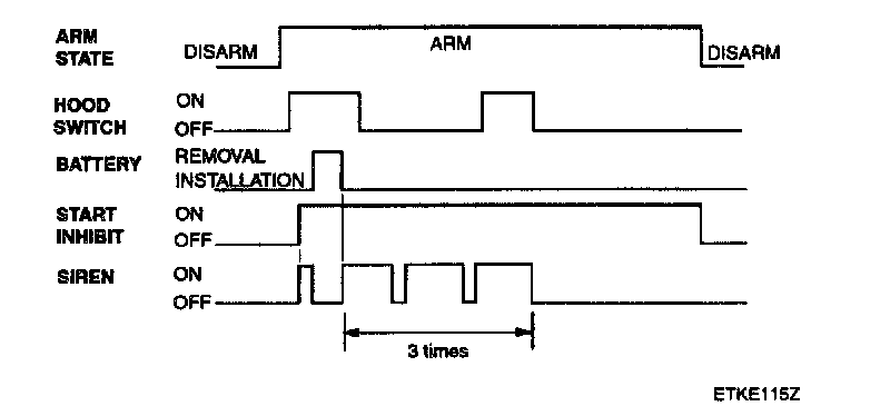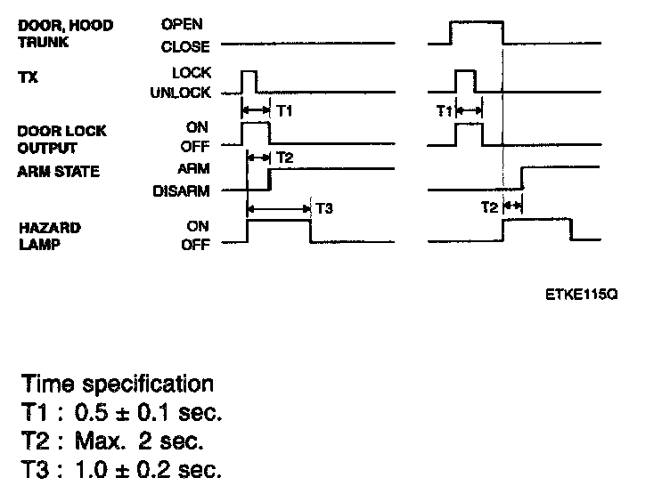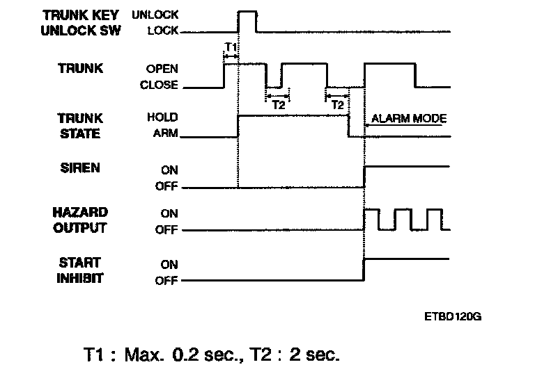 1. In case of opening the trunk by trunk unlock switch during arm state, the alarming is hold. When received transmitter TX) trunk signal in arm state, trunk open by output trunk lid open relay signal for 500 ms and then holding alarm. But the door and hood is still in the arm state.