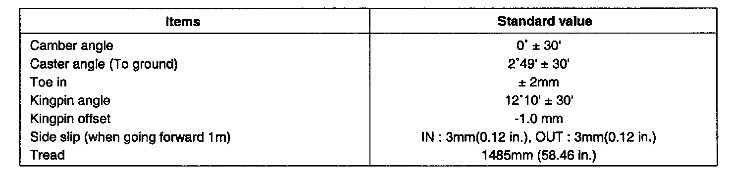 NOTE: Difference between left and right camber angle is within 0°30'. Difference between left and right caster angle is also within 0°30'.