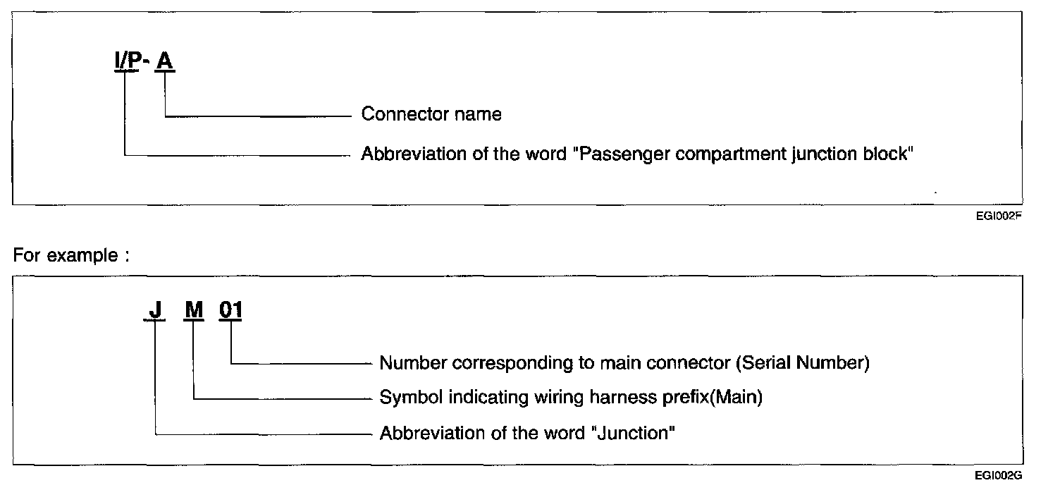 A junction block identification symbol consists of a wiring harness location classification symbol corresponding to a wiring harness location and number corresponding to the connector in the junction block.