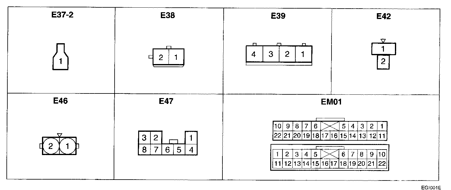 This shows the cavity or terminal locations in all the multi-pin connectors shown in the schematic diagrams. It will help you to locate check points, together with the wire colors and terminal numbers in the schematic. The configuration drawings show the connector view as seen from a component after the harness connector has been disconnected. When more than one connector is connected to a component, the connectors are all shown together. Both halves of in-line connectors are shown together.