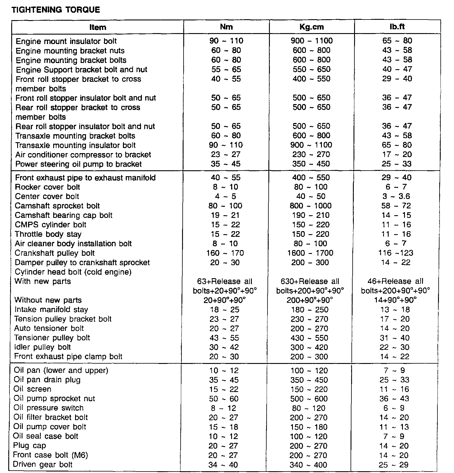Tightening Torque Specifications