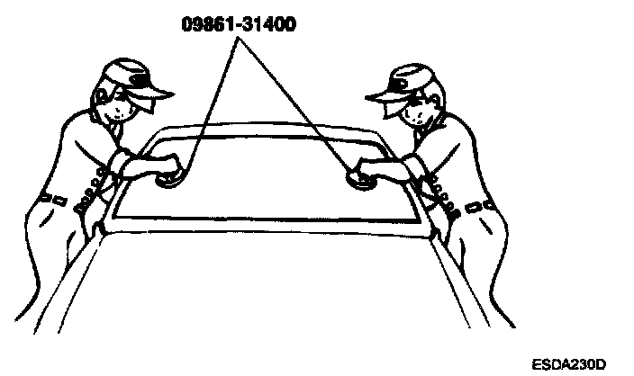 10. Using suction cups or the special tool (09861-31400), lower the glass over the opening, align it with the marks made in step 3 and set it down on the sealant.
