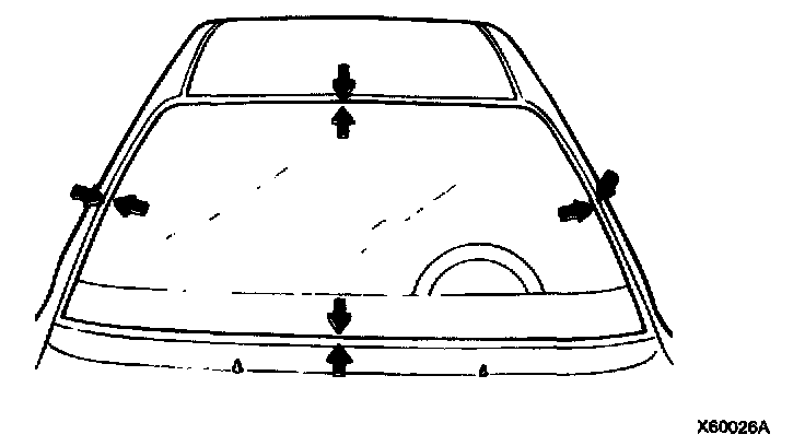 3. Center the new windshield glass in the opening. Mark the location by marking lines across the glass and body with a grease pencil at the four points as shown.