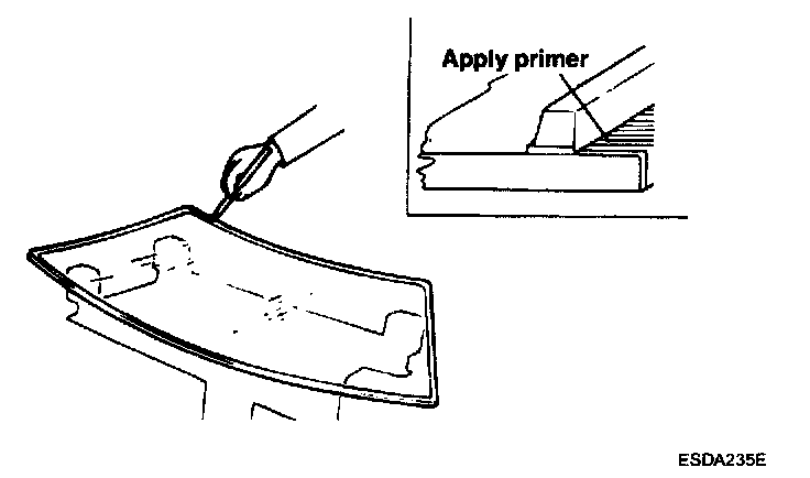9. Apply a light coat of body primer to the original sealant remaining around the window opening flange. The glass should be installed within 10 minutes after you apply the primer.