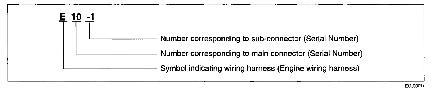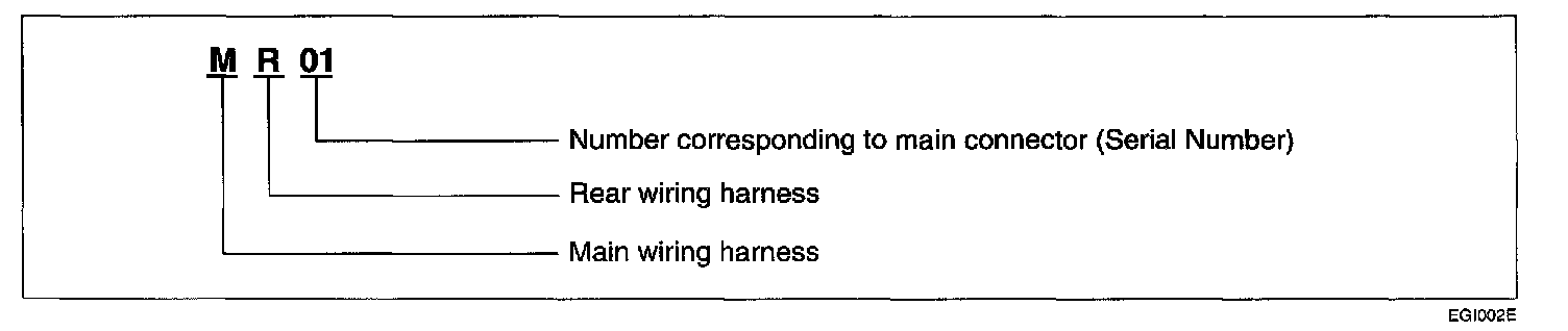 A connector identification symbol consists of a wiring harness location classification symbol corresponding to a wiring harness location and number corresponding to the connector. These connector locations can be found in the HARNESS LAYOUTS.